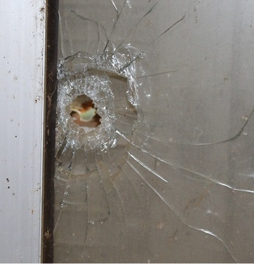 Dans un pièce du sous-sol, nous avons remarqué plusieurs jours après, tout à fait par hasard, que les 2 vitres de la fenêtre étaient trouées... ainsi que le volet en bois, toujours fermé. Les trous successifs vont en s'élargissant de plus en plus, de l'extérieur vers l'intérieur; le plâtre du mur en face de la fenêtre est marqué par un trou !